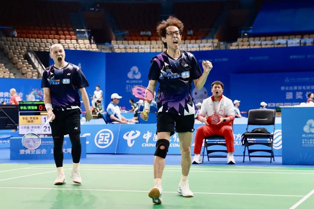 王明基/李钧照在决赛的首局顺风顺水,但在次局率先拿到赛点之后与对手比分胶着,他们最终顶住压力,以24比22锁定胜局。王明基赛后总结,“我们的准备很充分,比赛中也始终保持着拼搏的心态,完成教练的战术部署,当然也有那么一点运气。”赛后,两人都很激动。李钧照说,“8年前全运会首次设群众羽毛球项目我就参赛了,但当时遗憾未能获得佳绩,经过这么多年的努力,现在终于有了回报,这块金牌的分量真的很重,心情久久不能平复。”两人都是第二次参加全运会,但也都是第一次拿到金牌,可谓如愿以偿。作为东道主,在粤港澳三地举办的全运会上夺金,王明基更加觉得意义非凡。他认为,全运会与普通赛事相比,在组织、着装、仪式感及氛围等方面完全不同,规格更高,荣誉感也不同。至于如何庆祝?王明基说,“会先陪伴家人,因为备战全运会的关系总是不在家,还会请球友们吃饭,发红包”。